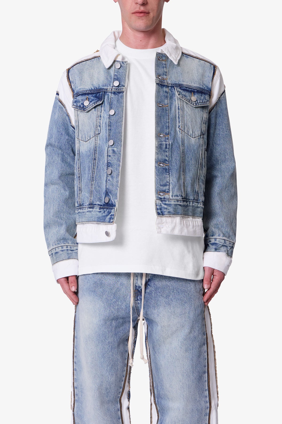 The Border GN8 Jacket is a reconstructed denim jacket made from 100% cotton in a light blue wash. Designed with a relaxed fit, it features a contrast collar, contrast shoulder paneling, a double layer hem, and exposed seam detailing. The Border GN8 Jacket maintains the structure of a standard denim jacket with updated construction elements.
