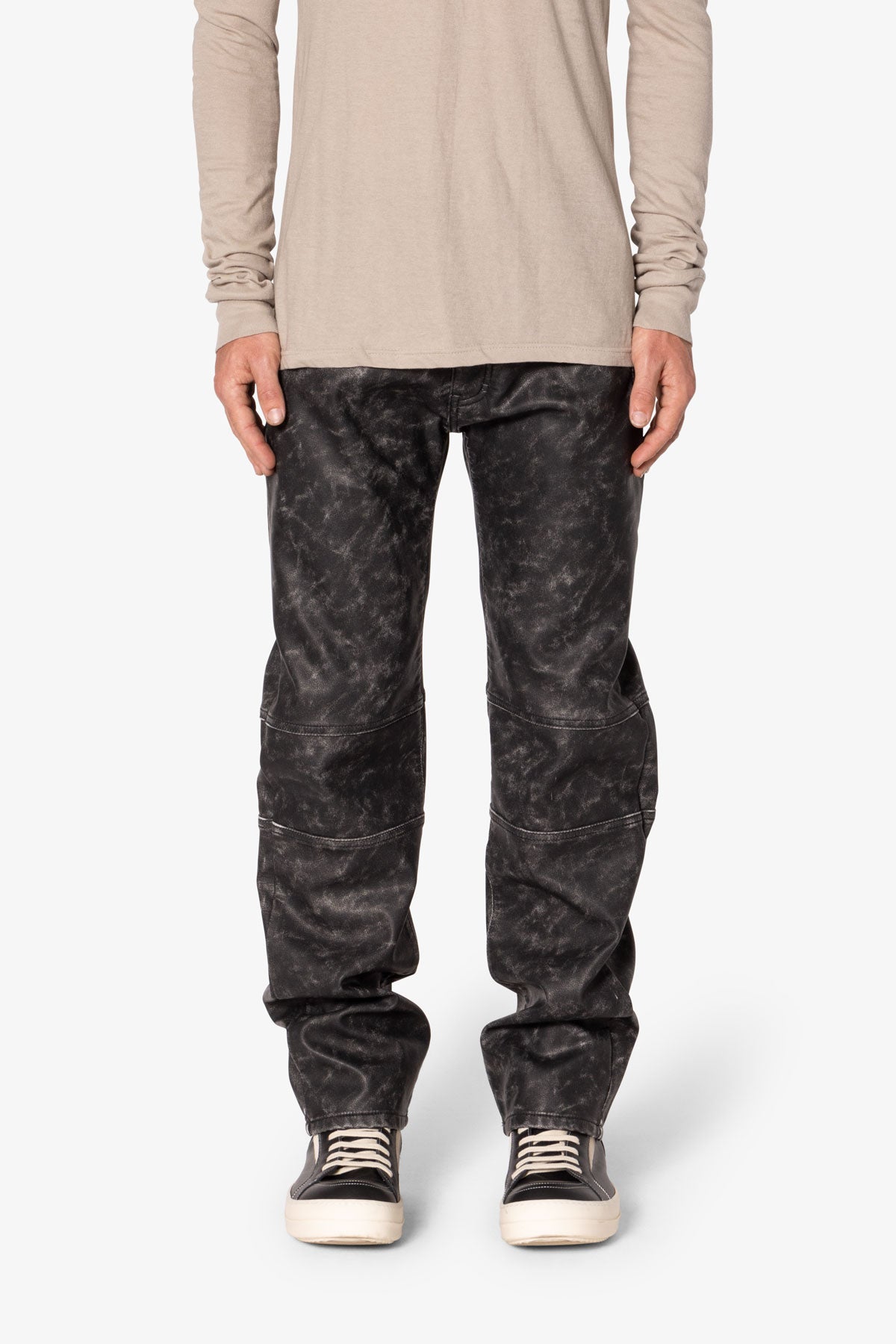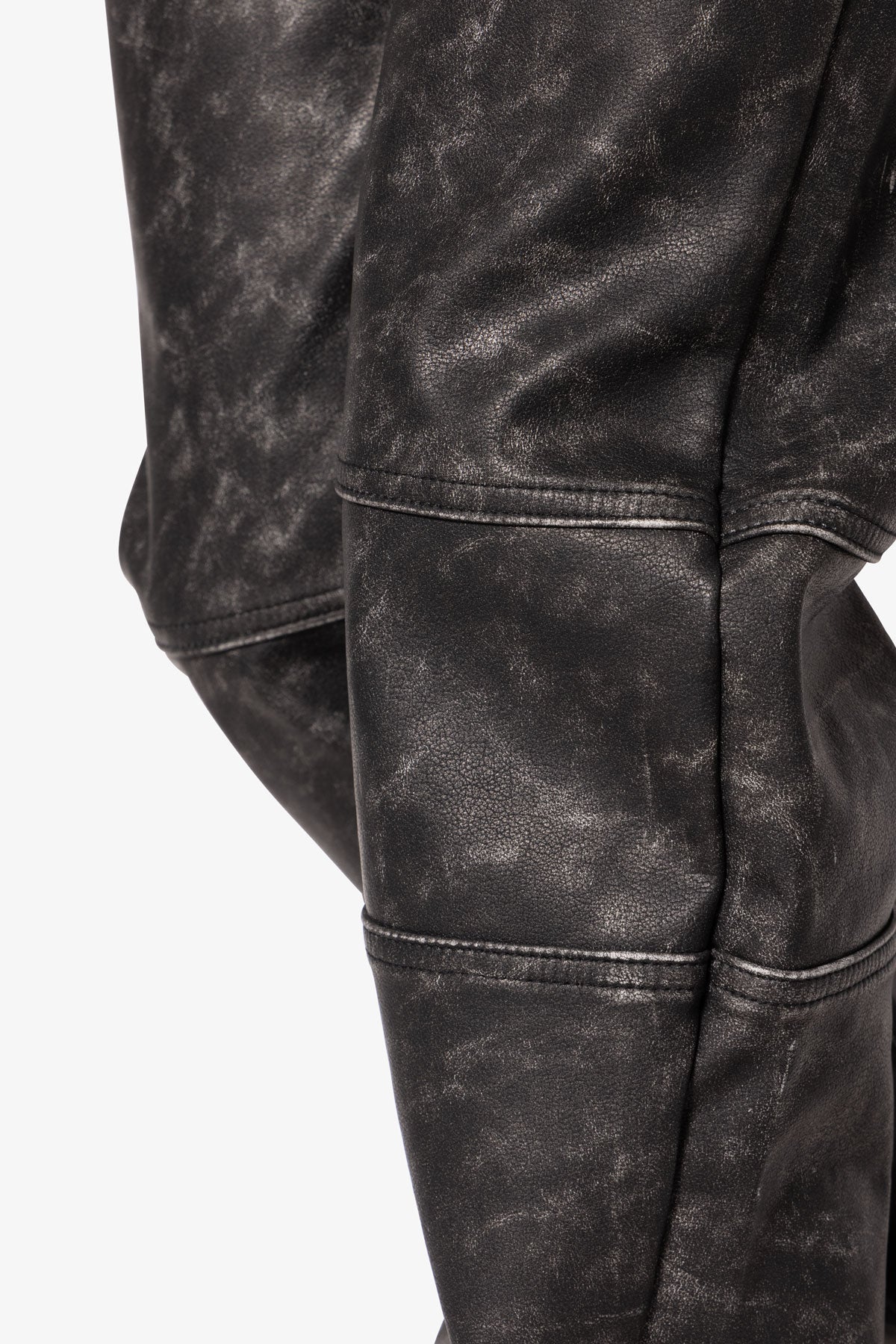 the V706 Washed Leather Pants is designed with our new V fit which is relaxed throughout, has a black gradient faux leather fabric made of 100% cotton, panel stitching along the knees, and charming zipper lined pockets.