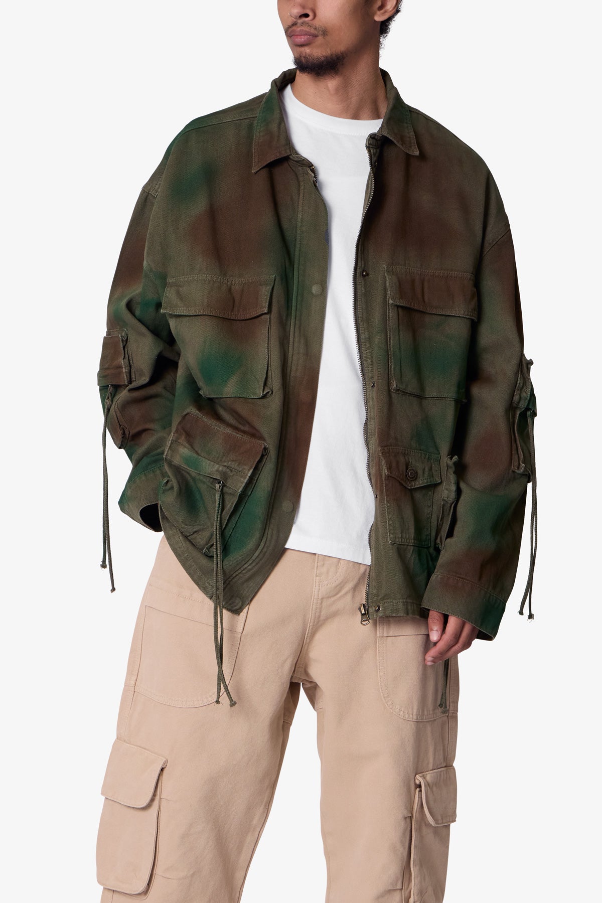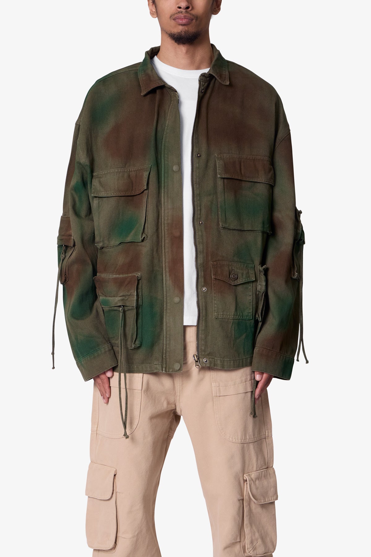 the NR10 Jacket is designed with a relaxed fit and featuring a zipper and snap placket and pockets throughout the front and sleeves. The heavy olive twill base undergoes a vintage wash with a sprayed camo pattern throughout, that’s both visually striking and pleasing to the touch.